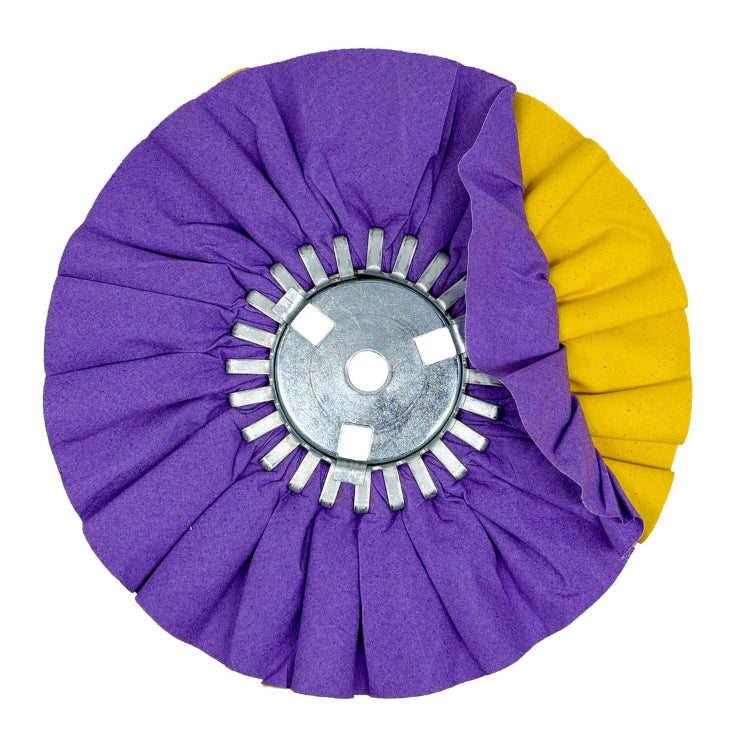 Our "Jester" Airway Buff incorporates our Purple and Yellow Buffing Wheel fabrics to provide a more subtle cut with the yellow fabric that is followed the softer purple fabric to help create a more seamless transition before moving on to your finishing buffing wheel and compound bar combination.
